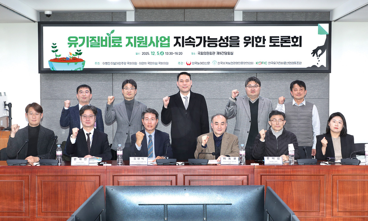 이병진 더불어민주당(평택을) 의원·이만희 국민의힘(영천·청도) 의원(주최)과 한국농어민신문·한국후계농업경영인중앙연합회·한국유기질비료산업협동조합(주관)은 지난 12월 5일 국회의원회관 제9간담회실에서 ‘유기질비료 지원사업 지속가능성을 위한 토론회’를 개최했다. 이번 토론회는 유기질비료 지원사업 예산 감축의 우려를 실수요자인 농업인에게 알리는 가운데 유기질비료 지원사업의 효과를 제고할 수 있는 대안을 모색하기 위해 마련됐다.